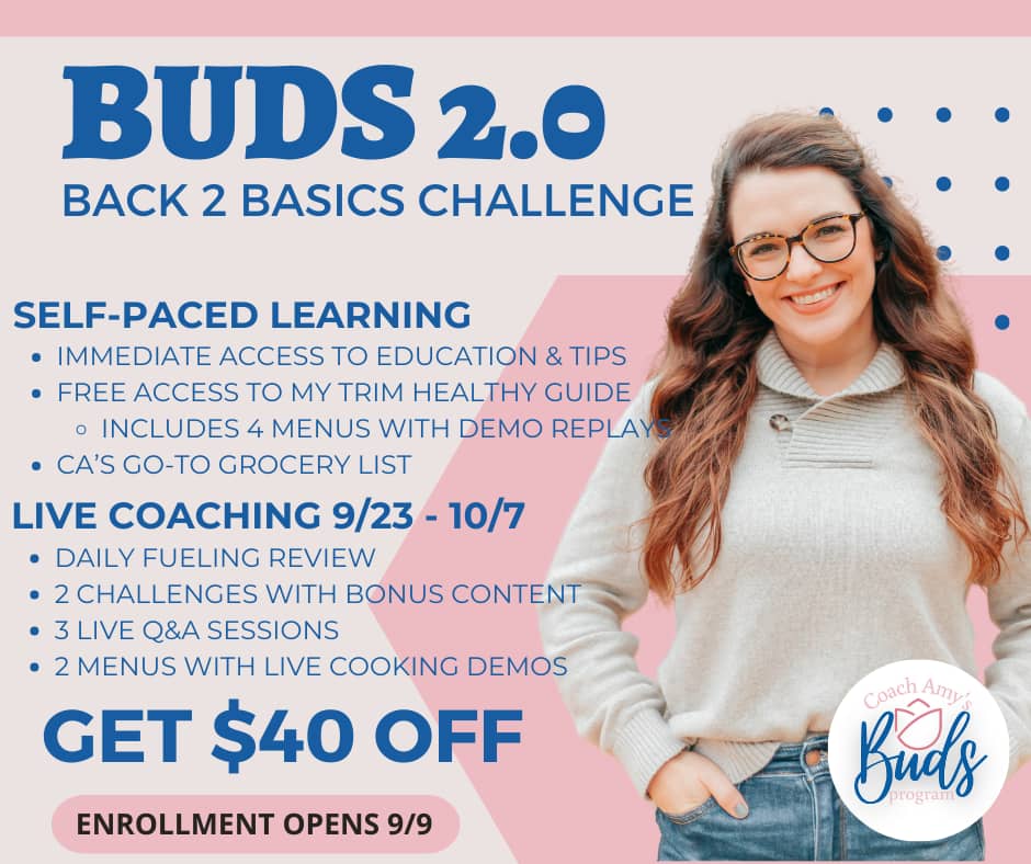 Let's chat about the details of all that's included in this Back to Basics Challenge, BUDS 2.0: 2 Weeks of Learning - gain immediate access to my 6 Steps of Buds Education Modules, designed to help you understand Trim Healthy like never before! 2 Weeks of Live Coaching - access to 7.5+ year Trim Healthy vet during this time with 3 Live Q&A's - the floor is open and I am ready to support you! +more During the live session, you'll benefit from daily fueling reviews from me, Coach Amy, helping you make the best choices for your body. I'm also spicing things up with two engaging challenges:
